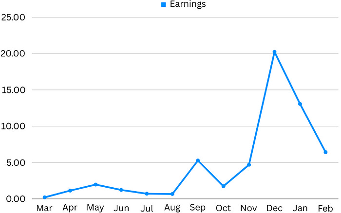 This graph shows my earnings for my first year as a Medium member starting in March 2024. The earnings shot up when I became a Friend of Medium in December, but they plummeted in January and crashed in February.