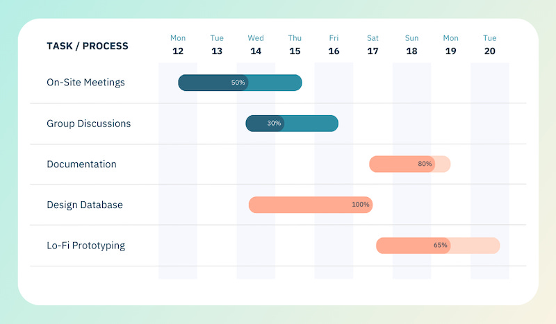 Gantt charts are used to schedule project tasks. Invented by Henry Gantt, they take the form of a horizontal bar chart with time on the horizontal axis and tasks on the vertical axis. The ends of the bars represent the start and finish times of the tasks.