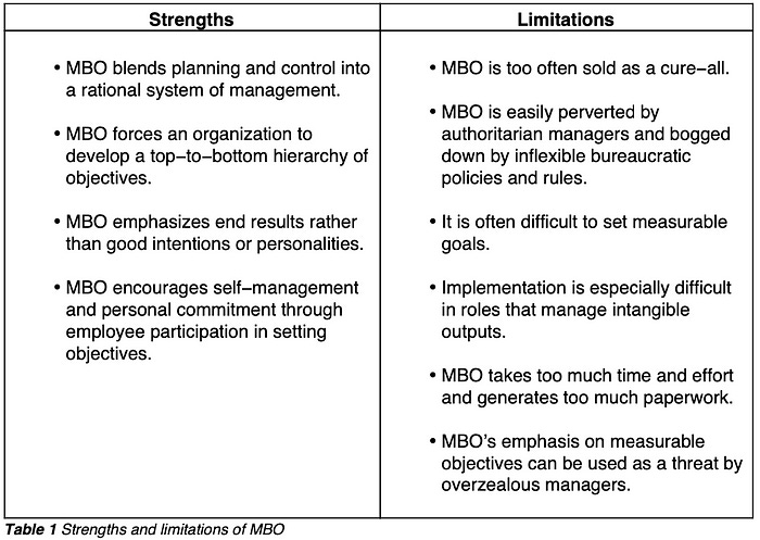 Although MBO has many strengths — and has been influential in helping to bridge the gap between an individual’s needs and the goals of an organisation — it does have several drawbacks. MBO’s strengths and limitations are summarised in Table 1.