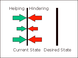 Forcefield Analysis identifies those forces which both help and hinder you from closing the gap between where you are now and where you want to be. Helping forces are people or circumstances driving you to reach your goal. Hindering forces restrain you from reaching your goal. Forcefield Analysis is useful in analysing problems because it is a way of identifying all possible factors contributing to a problem, especially when dealing with subjective issues that are difficult to quantify. It is also useful for identifying potential solutions, as there are three approaches to closing the gap: